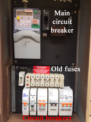 In the meter box, the incoming lead called ACTIVE, a brown (or red in old houses) wire, is split into parallel systems each passing through a meter, a fuse or circuit breaker, then out into the house.