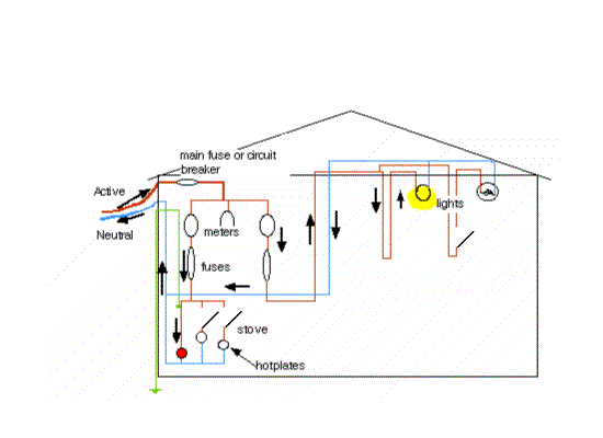 In the house, the active wire is split further into parallel circuits, passed through a switch and then into the hotplate, light or whatever.