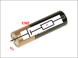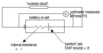 The theoretical PD produced is called the "electromotive force" the EMF, ε . This is a term from the early C19th. This is produced across the terminals when the current is zero!