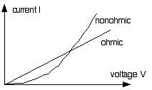 Graphically, this means as we raise the potential difference across the material, for ohmic resistors, the current rises proportionately, ie, a straight line through the origin. Nonohmic materials rise all sorts of strange ways!