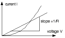 For ohmic materials, the resistance is the inverse of the slope of the straight line. Two forms of resistance exist for nonohmic materials, the inverse average slope and the inverse slope at the voltage of interest. The latter is far more interesting.