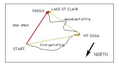 The map shows the start of the trip, the first destination ( Mt Ossa ) and the track to it, and the second destination and its track ( Lake St Clair ). The DISTANCE WALKED will be the total along the tracks, but the DISPLACEMENT on each section is the arrow. The TOTAL DISPLACEMENT is the thick arrow from start to finish. ( Remember that displacement is the straight line from start to finish with direction! )