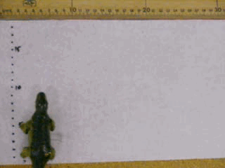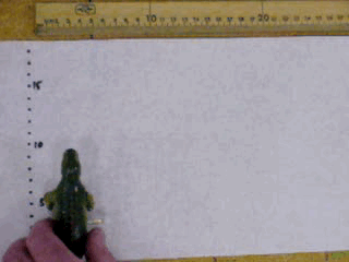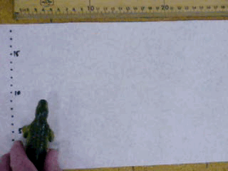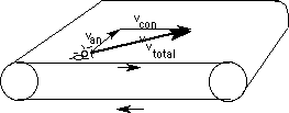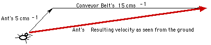 The ant is attempting to cross the conveyor belt. It can run at a speed of 5 cms-1. The conveyor belt travels continuously at 15 cms-1. In one second then, the ant runs 5 cm, the conveyor belt 15 cm.
