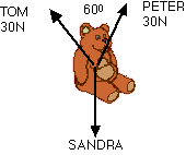 6. Sandra (aged 7 ) has two boyfriends, Tom and Peter ( both 6 ) ( Sandra likes younger boys ). Sandra has a Bear which is very dear to her but is grabbed by both Tom and Peter who each pull with a force of 30N at an angle of 600 to each other.