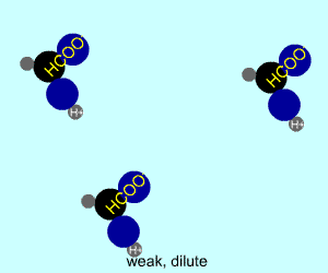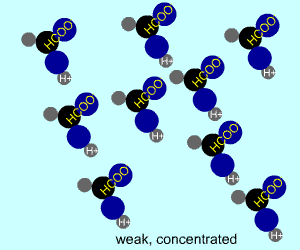 The table above shows the four possibilities: high and low concentration and high and low dissociation. Note that the window that is high on both counts (upper left) has lots of ions (H+), therefore the lowest pH. The window that is low on both counts (lower right) has very few ions, so a higher pH number. The other two windows have roughly the same number of ions, so a middling pH number. In real life either could be greater than the other; this is only an approximation.
