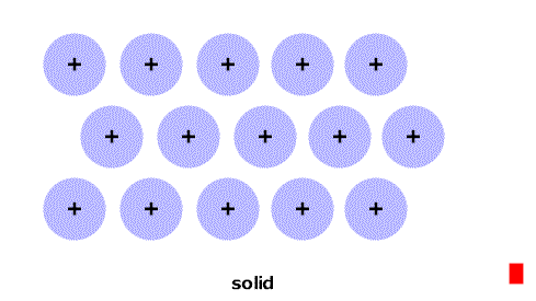 As the temperature increases the particles have more energy and are more active. At particular temperatures some of the attractions between them are overcome and the state changes: solid->liquid->gas. (Think of the red stripe as a thermometer.) |