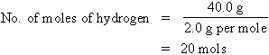 How many moles of hydrogen gas will be produced from a reaction that evolved 40 grams of the gas? (Molecular mass of hydrogen gas, H2 = 2.0.)