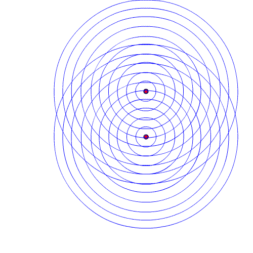 Every 2 seconds, the animation shows the confocal hyperbolic set of Antinodal lines. These correspond to lines along which the circular waves from the two sources always arrive exactly in phase, crest meets crest and trough meets trough.If you carefully watch the lines you will see this.