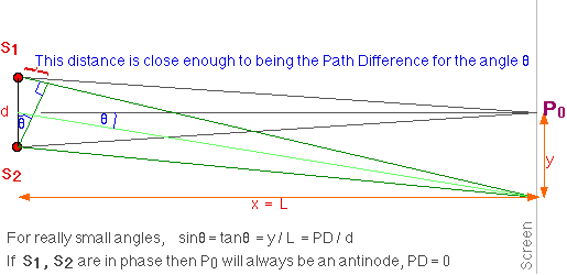WHEN THE SOURCES ARE VERY CLOSE TOGETHER compared to the distance along an antinode THEN - we can make simplifying approximations like sin θ = tan θ - which is more or less true for angles smaller than 50 - check it on your calculator if you don't believe it.