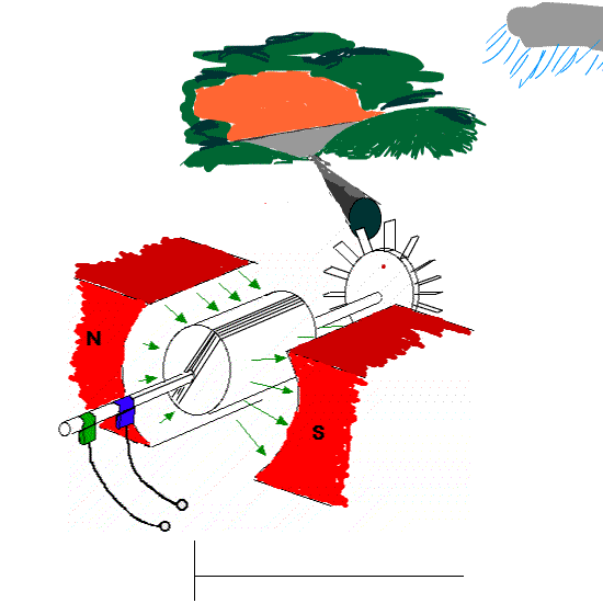 As the generator is spun by the energy source ( water flow ) the sides of the rectangle wrapped around the central core move through the fields lines. Charges in the wires respond to F = IlB sinθ and RHScrew Rule and are forced to one of the brushes contacting the circles on the shaft.