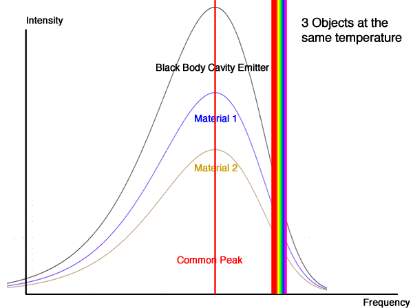 All "hot" bodies of the same temperature have the same shape radiation graph with a peak at a characteristic point absolutely dependent on the temperature. However, different materials have different brightnesses of radiation. Tungsten in a filament lamp emits the same shape curve but at a slightly different strength than a ceramic at the same temperature.