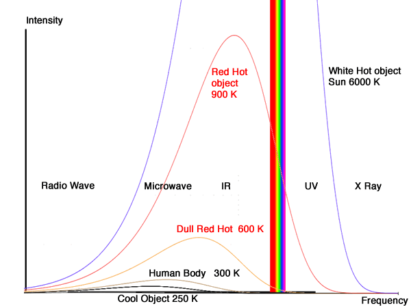 We humans are at a temperature of 370C or 310 K. We therefore emit radiation with the peak in the infrared at 9.3 μm. We also emit microwaves and radio waves. A hot plate at 4000C or 673 K will have a peak at 4.3 μm but will also emit a little in the visible red. It will appear red hot!