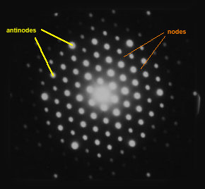 The above pattern is of electrons passing through a single crystal . Bright spots are antinodal, dark spaces are nodal.
