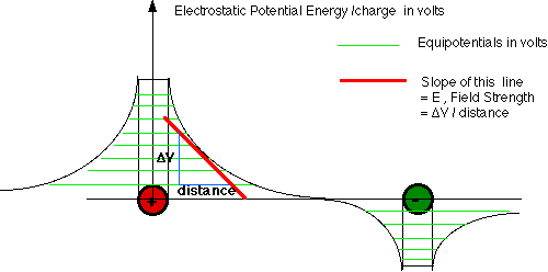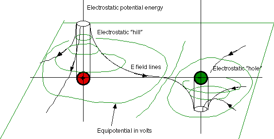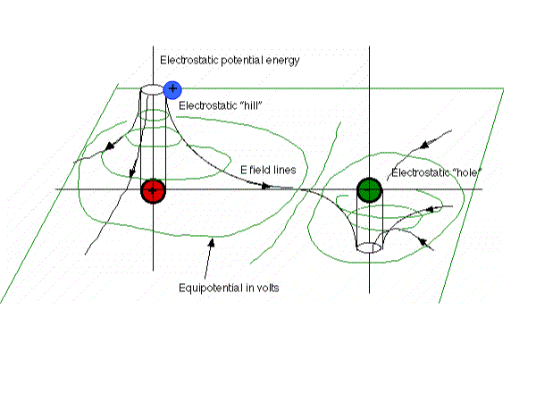 A positive "test charge" near the red positive charge will then be repelled and attracted from the Force view - but in the energy view, it will lose ELECTROSTATIC potential energy, qV and gain kinetic energy.