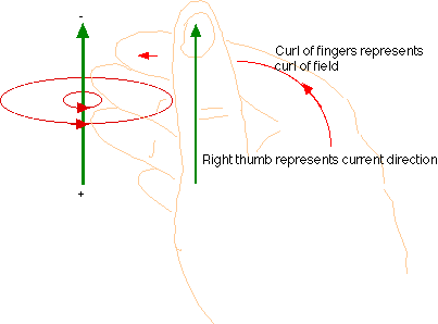 Here the thumb sticking up represents the current, and the curl of the fingers represents the field line and direction.