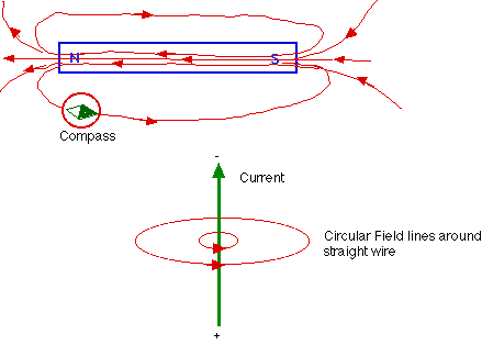 In the diagram above, the direction a compass needle points near a "conventional" current ( flowing from + to - terminals ) is closed WITH NO START OR FINISH. This is clearly different from electrostatics and gravity where field lines start and finish at objects. Magnetism seems to have no individual "North poles"and "South poles", a problem for many subnuclear physicists.This is true even in metal bar magnets as well as current magnets.