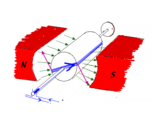 Each side of the rectangle has the force F= IlB acting upon it, one side UP, the other side DOWN. The system will rotate until the wires are at top and bottom. This is stable and rotation will cease. So to continue rotation, we provide a simple automatic switch reversing the current. This automatic switch is the COMMUTATOR, bits of copper plate stuck to each side of the axle and turning with it. Brushes rubbing the plates bring the current into the rectangle.