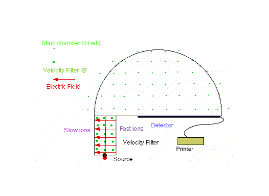 The machine shown, the Bainbridge variation, uses a mixture of Electric and Magnetic fields to ensure a single velocity stream of ions entering a uniform B field. Separation is by the Radius of Gyration, different ions moving to different radii to be sensed.
