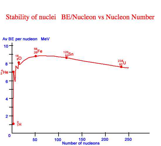 Going through all the isotopes and dividing each one's BE by the number of nucleons gives a curve which has a maximum around Fe-56. This element has a very stable nucleus. To create nuclei up to this element, fusion processes continue to release energy but beyond this point, energy is required assembling further nucleons. Fission of larger nuclei releases energy, fusion of lighter elements releases energy.