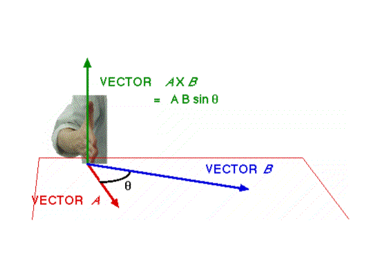 A X B = ABsinθ in size BUT the direction of the resultant is given by the right hand screw rule.