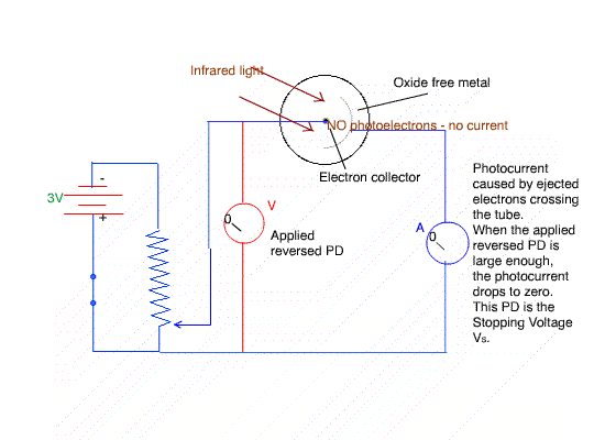 How is the energy of the electron measured? By placing a negative charge on the collecting wire so the emitted electrons are repelled from it - stopped. The minimum voltage needed to stop the ejected electrons is the "Stopping Voltage" Vs .
