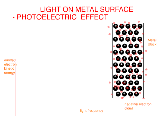 Here light is treated completely as a "ball" or marble. When it hits a metal, it interacts ONLY with ONE electron and EITHER has enough energy to eject the electron - or doesn't.