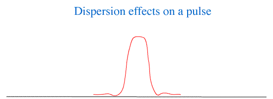 Material Dispersion; A square wave pulse can be shown to consist of an infinite series of continuous waves added together. (This can be shown by Fourier Analysis - a standard analytical process of waves from the early C19th.) Each component wave has a different wavelength so sees a different refractive index and travels at a different speed. The square pulse therefore spreads out with time and distance. ( Much the same effect can be seen in the bow wave of a ship. It starts as a single wave but spreads out into a series of waves with distance travelled.) Optical amplifiers and signal regenerators are needed every few hundred km to recreate the signal and signal strength.