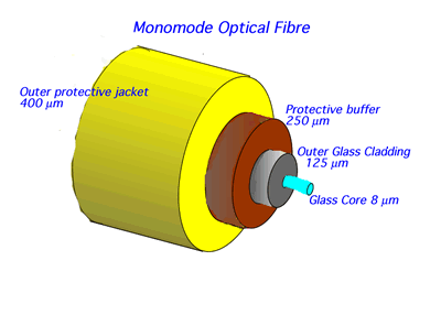 The effect of modal dispersion can be minimised by making the core so thin that the light cannot "bounce" from wall to wall but is confined directly along the core. These are the "mono-mode" or "single-mode" fibres. The core is about the same order of thickness as the wavelength of the transmitted light - about 8 to 10µm. So act as waveguides.