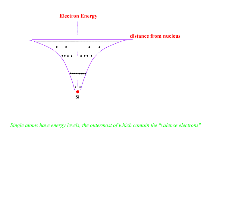 Individual atoms have energy levels holding all of the electrons. The shape of the electron energy curve with distance is of the form E ~ 1/r , hyperbolic.