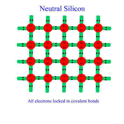 Using boron dopants, we end with a structure LACKING electrons in some places as boron has only three outer electrons. An extra electron is "borrowed" from elsewhere to make up the bond. The boron atom is called an acceptor. It will sit in the crystal as a negative charge. As the replacement can come from anywhere, the LACK of electron (a "hole") is moveable and equivalent to a mobile positive charge. This type of semiconductor is a p-type conductor. The mobile electrons are boosted into the discrete energy levels of the dopant just above the Valence band from the Valence Band to move around creating the holes in the Valence Band. The p-type "holes" move in the Valence Band.