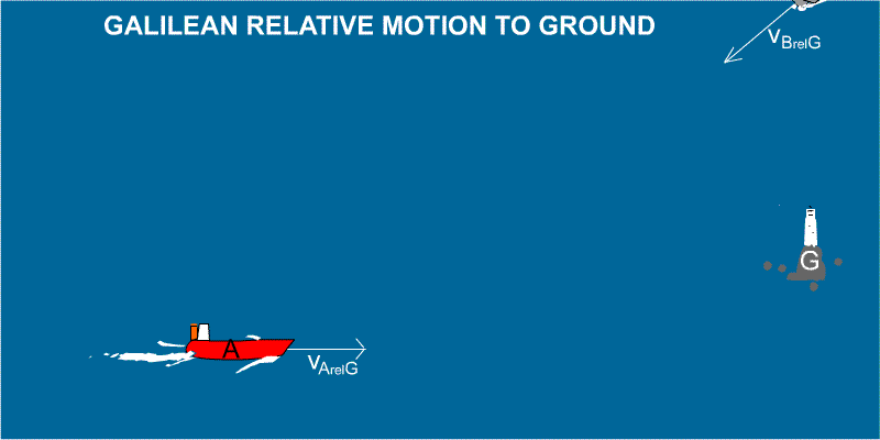 To see this in 2D, go to the animation below of two ships, A and B passing relative to a lighthouse, the ground, G.